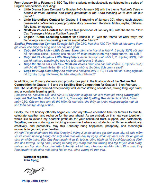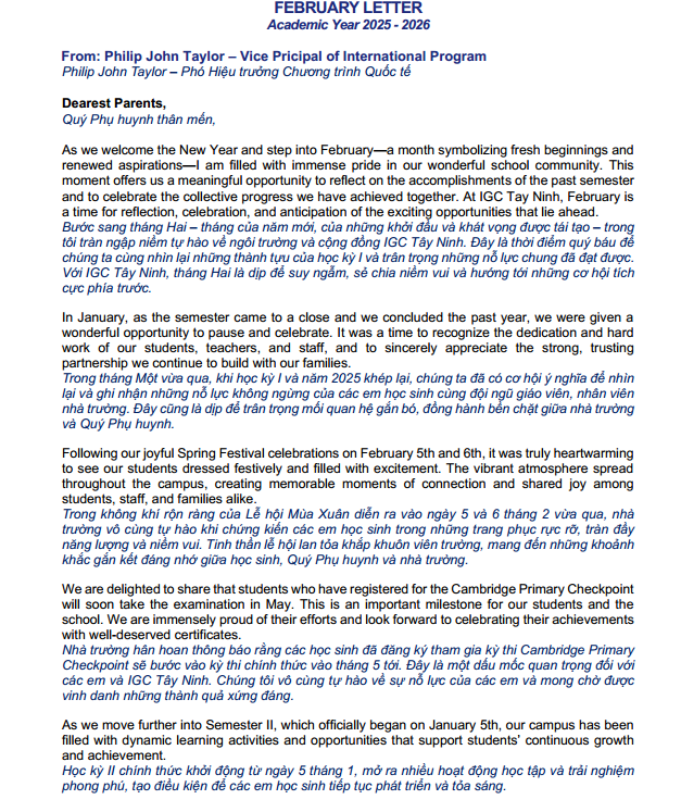 Nhà trường kính gửi đến Phụ huynh và các em học sinh Thư Ngỏ tháng 2.2026 của Thầy Phó Hiệu trưởng Philip John Taylor - phụ trách chương trình Quốc tế IGC Tây Ninh.